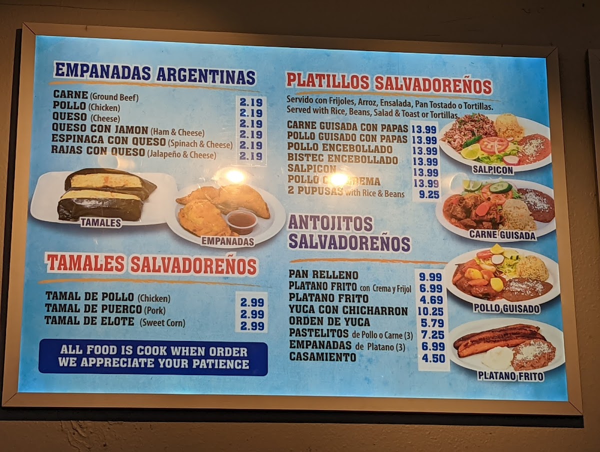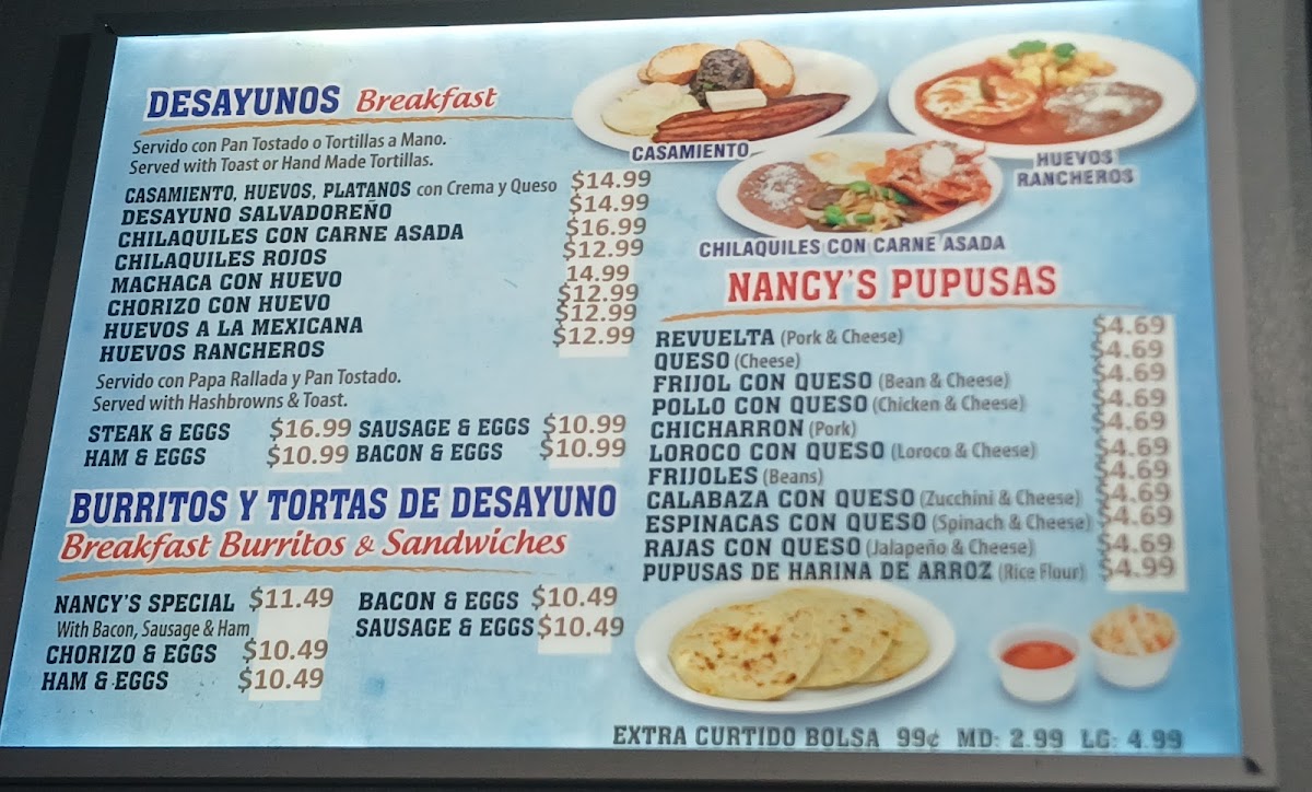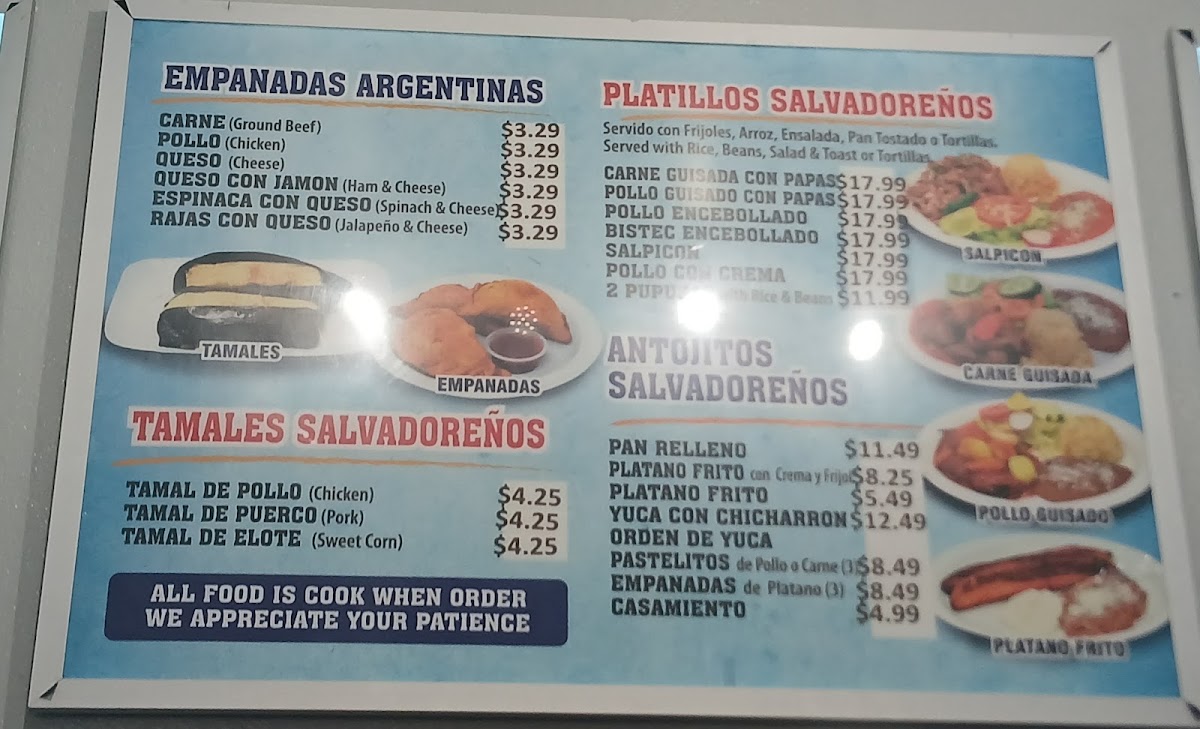 The menu at Nancy's Pupuseria offers a variety of traditional Salvadoran dishes alongside refreshing beverages. Food selections are centered around authentic items such as pupusas, empanadas, and traditional sides. Key food groups include grilled corn flour tortillas and several types of pupusas, including varieties filled with cheese, spinach, zucchini, and chicharrón. Empanadas are available with diverse fillings like beef, chicken, and traditional Salvadoran-style preparations. Additional side dishes include casamiento (rice and beans), plátanos fritos (fried plantains) served with crema, and pickled cabbage slaw (curtido).